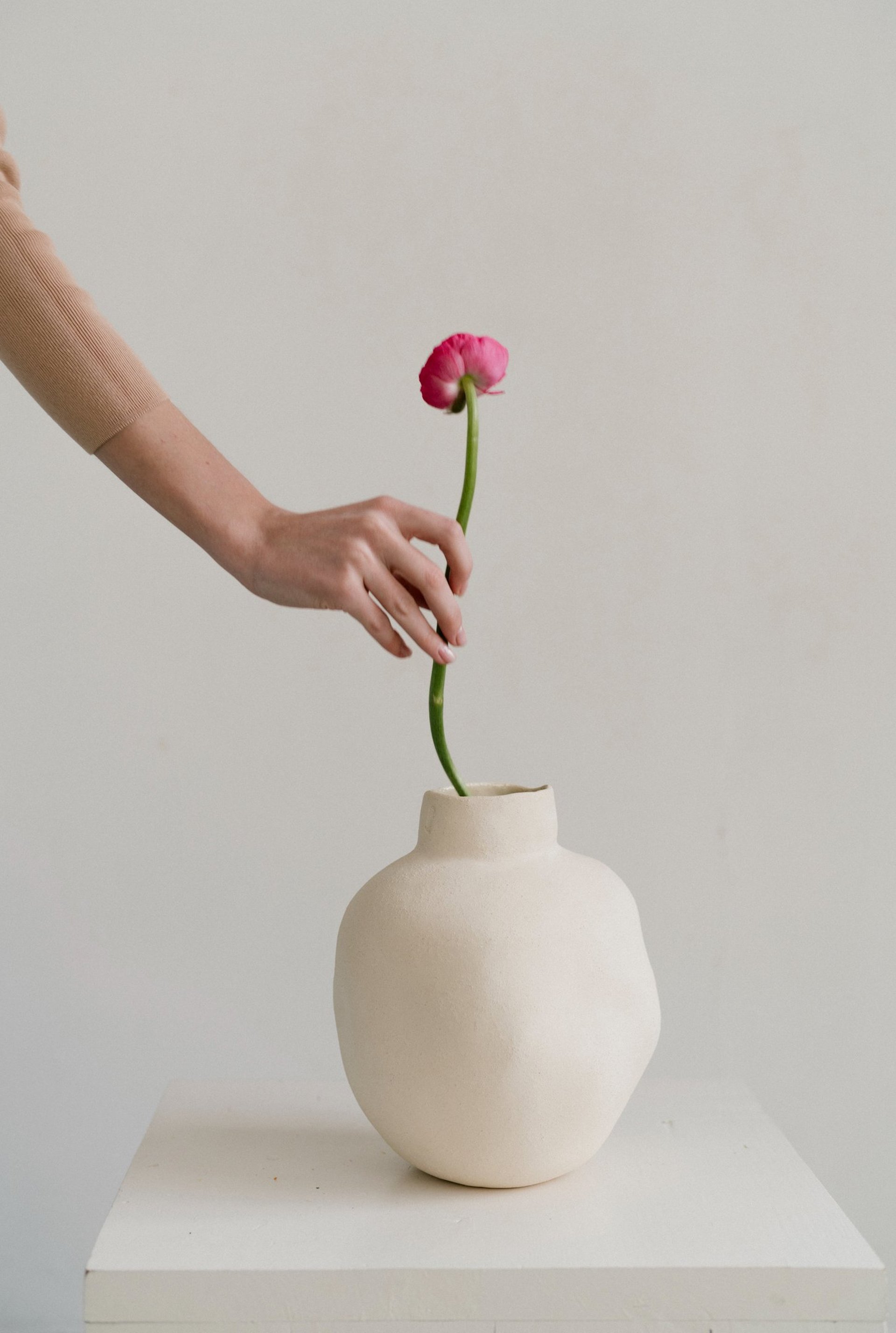 Guided by the raw beauty of clay, Olha creates handcrafted vases and abstract sculptural forms that celebrate contrast — soft, rounded silhouettes meet the textured roughness of chamotte.